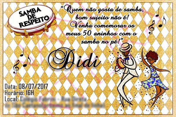 CONVITE ANIVERSÃRIO SAMBA no Elo7 . Compre CONVITE ANIVERSÃRIO SAMBA no Elo7 por R$ 15,21 | Encontre mais produtos de Convites de Aniversário e Convites parcelando em até 12 vezes | O preço acima equivale somente a arte do convite.