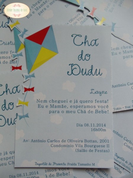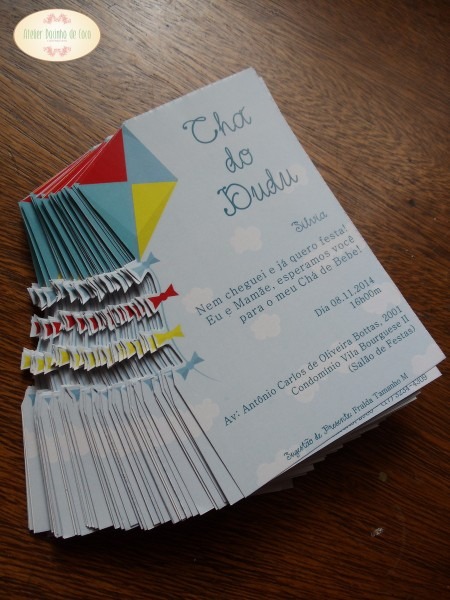 ***PEDIDO MÃNIMO 30 UNIDADES, FAVOR NÃO PEDIR MENOS*** Convite Tema Pipa para Chá de Bebê. Totalmente Personalizado, com nome do Beb⦠. ***PEDIDO MÃNIMO 30 UNIDADES, FAVOR NÃO PEDIR MENOS*** Convite Tema Pipa para Chá de Bebê. Totalmente Personalizado, com nome do Bebê, nome do convidado e o que o convidado deve levar. Tamanho: 10 cm x 15 cm. www.pinterest.com.au