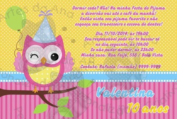 Convite Festa do Pijama Coruja no Elo7 . Compre Convite Festa do Pijama Coruja no Elo7 por R$ 2,30 | Encontre mais produtos de Convites de Aniversário Infantil e Aniversário e Festas parcelando em até 12 vezes | Convite impresso em papel fotográfico.