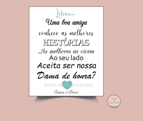 Amiga da Noiva, Dama e Madrinha! no Elo7 . Compre Amiga da Noiva, Dama e Madrinha! no Elo7 por R$ 10,00 | Encontre mais produtos de Convites de Casamento e Casamento parcelando em até 12 vezes | Antes de clicar em COMPRAR ESTE PRODUTO, ao lado direito da tela tem um Ãcone CONTATAR VENDEDOR, ali você pode tirar toda as suas dúvidas..., BAD5A3 www.elo7.com.br