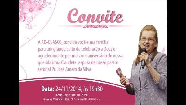 Culto de ação de graças pelo aniversário da irmã Claudete Cabrel . Produzido por Studio AD-OSASCO Igreja Evangélica Assembléia de Deus Min. Belém - Setor 05 Osasco Rua Alice Manholer Piteri, 307 - Bela Vista - Osasco SP www.... www.youtube.com