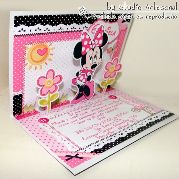 Convite Pop Up . Compre Convite Pop Up - Minnie Rosa no Elo7 por R$ 6,49 | Encontre mais produtos de e Papel e Cia parcelando em até 12 vezes | Ao abrir o convite os personagens ficam de pé à frente do convite.