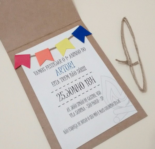 Convite Festa Junina no Elo7 . Compre Convite Festa Junina no Elo7 por R$ 1,50 | Encontre mais produtos de Convites de Aniversário Infantil e Aniversário e Festas parcelando em até 12 vezes | Convite preenchÃvel de kraft com mini bandeirolas feitas à mão.