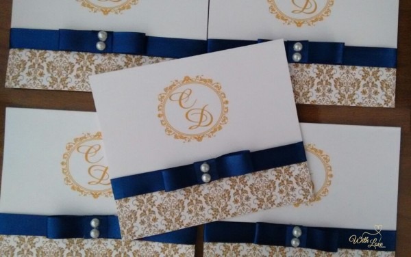 Impresso em papel com gramatura 180g detalhe arabesco dourado, fita cetim azul marinho, laço chanel com pérola e b..., 9759FD www.elo7.com.br