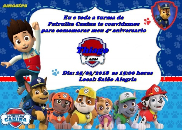 30 Convite Patrulha Canina . Compre-o no Mercado Livre por R$ 36,00 - Compre em 12x. Encontre mais produtos de Brinquedos e Hobbies, Ar Livre, Malabares e Festas, Festas , Convites, Aniversário Infantil. produto.mercadolivre.com.br