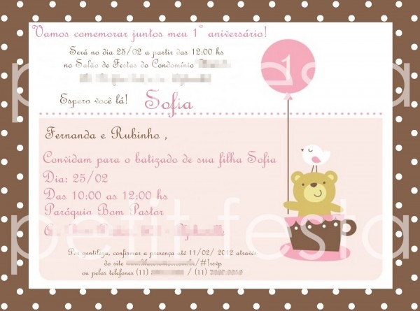 Convite January 6, 2019January 5, 2019 by WadeConvite de aniversario e batizado juntos Sablyna Colino . Aquele momento único da vida de uma famÃlia ao consagrar a Deus uma pequena vidinha!Para o batizado a mamãe e o papai escolheram Raquel e Diogo para abençoarem a doce Isa.Petit Festa: Batizado e 1º ANO !!!! Menina. petitfesta.blogspot.com Related posts:Qual O Tamanho Do Convite De CasamentoConvites de casamento campo grande msConvites dos carros personalizadosPost navigationConvite de 15 anosConvite dora mapaLeave a Reply Cancel replyYour email address will not be published. Required fields are marked *Comment *Name * Email * Website Save my name, email, and website in this browser for the next time I comment. Δ