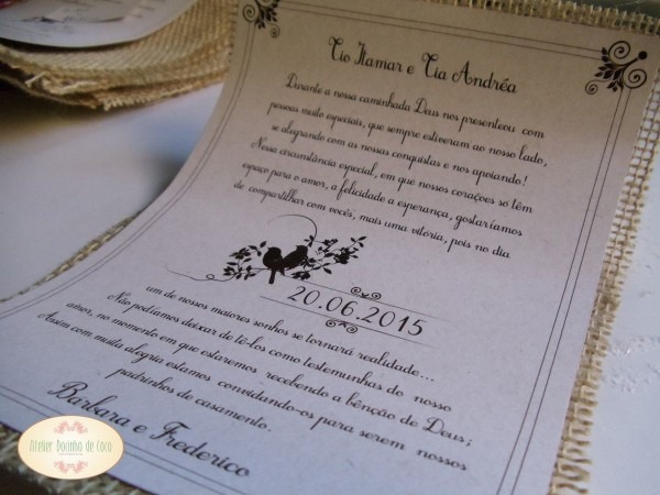 Convite de Casamento Rústico. Tamanho: 21cm x 16cm. Convite em Papel Reciclável 250G. Base em juta. Laço de sisal. Tag de recicláve⦠. Convite de Casamento Rústico. Tamanho: 21cm x 16cm. Convite em Papel Reciclável 250G. Base em juta. Laço de sisal. Tag de reciclável com a inicial dos noivos. Grátis: - Até 300 Convites individuais. - Sugestão de Presente. (1 Para cada convite). ***PRODUÃÃO MÃNIMA 30 UNIDADES!*** www.pinterest.de
