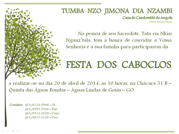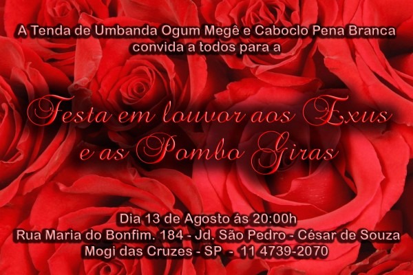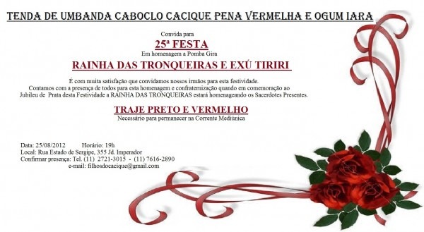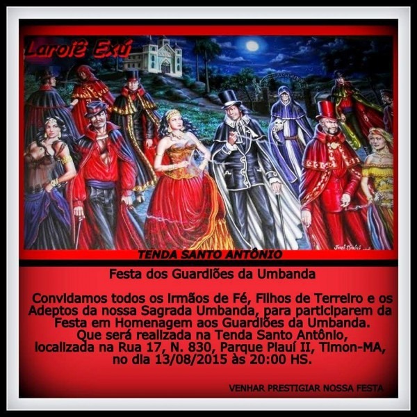 CONVITE FESTA DO SEU TRANCA RUAS DAS ALMAS . Convidamos à todos os Irmãos de Fé, Filhos de Terreiro e os Adeptos da nossa Sagrada Umbanda, para participarem da Festa em Homenagem aos Guardiões da Umbanda. Que será realizado na Tenda Santo Antônio, localizada na Rua 17, n° 830, Parque Piauà II, Timon - MA, no dia 13/08/2015 às 20:00 horas. Venha prestigiar nossa⦠tendadesantoanonio.wordpress.com