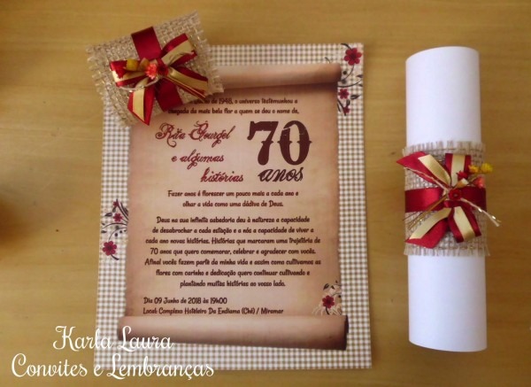 Convite de aniversário pergaminho rústico, feminino e com juta. Rita Rangel e Ana Rita . www.karlalaura.com.br
