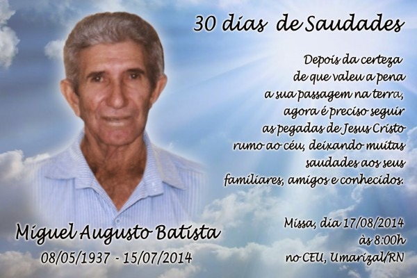 Convite February 7, 2019February 7, 2019 by TishConvite de missa de 30 dias Convite! Os familiares de Miguel Augusto Batista, convidam familares, parentes, amigos e conhecido para a sua missa de 30 dias de saudades . www.walterbatista.com.brESTRELA DE EMAS FUTEBOL CLUBE: Convite Missa de 30 dias . estreladeemas.blogspot.com Related posts:Programa fazer convites personalizadosConvite de aniversario para festa a fantasiaConvites de casamento deluxe s?o paulo spPost navigationConvite aniversario baby disneyConvite de aniversario super marioLeave a Reply Cancel replyYour email address will not be published. Required fields are marked *Comment *Name * Email * Website Save my name, email, and website in this browser for the next time I comment. Δ