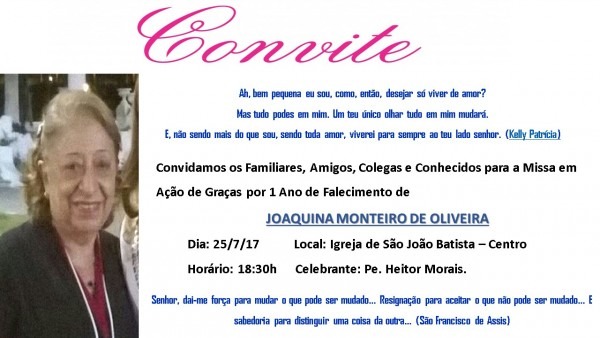 Missa convite: 1 ano do falecimento da associada Joaquina Monteiro de Oliveira . sintema.org.br