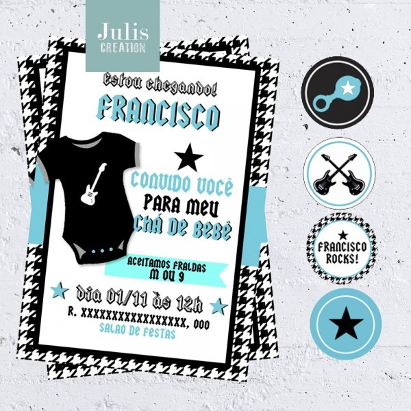 Convite chá de bebê rock no Elo7 . Compre Convite chá de bebê rock no Elo7 por R$ 3,75 | Encontre mais produtos de Convites de Festa Infantil e Convites parcelando em até 12 vezes | Impressão em papel especial brilhante;