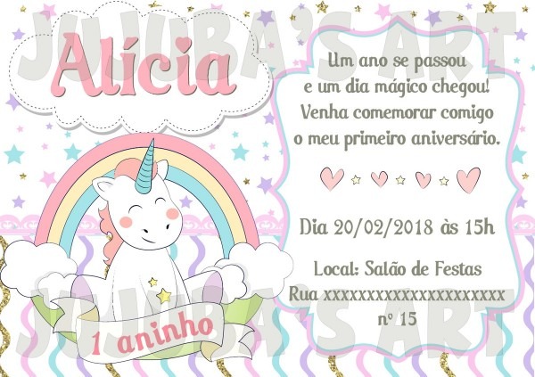 Convite Unicórnio . Convide sua FamÃlia e seus Amigos para comemorar esse momento encantador com você! Temos vários outros Modelos e Temas. Tudo em Artigo de Festa. Confira! www.bibibrindes.com