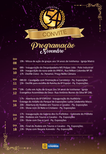Confira a programação do 54ú Aniversário de Ivinhema . www.ivinhema.ms.gov.br