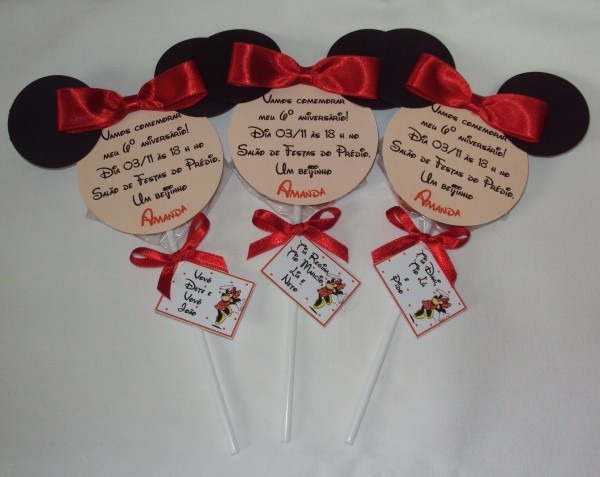Convite Minnie Pirulito . Criação de convite diferenciado para o tema de aniversário da Minnie.  A capinha do pirulito é no formato do rosto da Minnie, podendo ser utilizado a foto da criança também conforme mostramos na foto principal. No verso da capinha estão as informações da festa.        tkrfotos.com