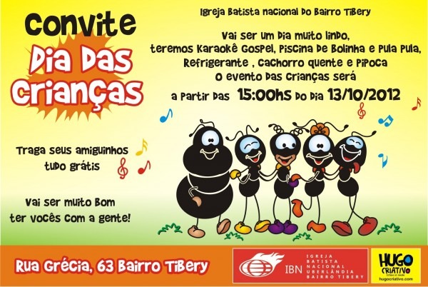 Convite para Festa do Dia das Crianças . Local: Rua Mascarenhas de Moraes, em frente a Comunidade Profética Novo Tempo. InÃÂcio do evento 9h www.youtube.com