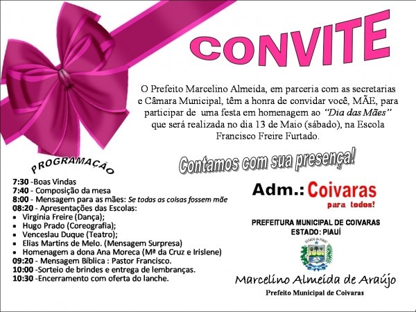 Prefeito Marcelino convida às mães de Coivaras para participar de festa. 180graus - O maior portal de notÃÂcias do Piauàtraz notÃÂcias de todas as cidades do estado e também de diversas cidades do Maranhão e DF 180graus.com