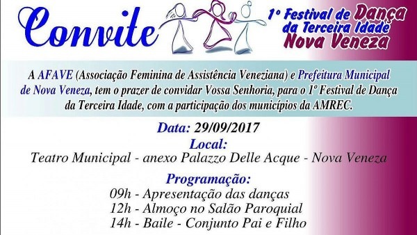 Afave promove 1º Festival de Dança da Terceira Idade, em Nova Veneza . O evento é alusivo ao Dia Mundial do Idoso, comemorado no dia 1º de outubro. A Associação Feminina de Assistência Veneziana (Afave) promove nesta www.portalveneza.com.br