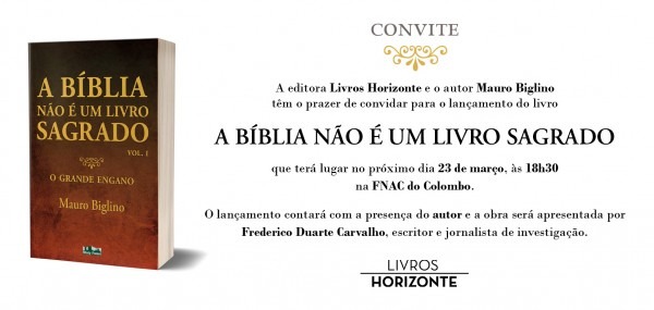 Autor Italiano da Obra «A BÃblia não à Um Livro Sagrado» em Lisboa . Mauro Biglino estará em Portugal para o lançamento da edição portuguesa do seu livro A BÃblia não é um livro sagrado, que decorrerá na Fnac do Colombo no dia 23 www.livroshorizonte.pt