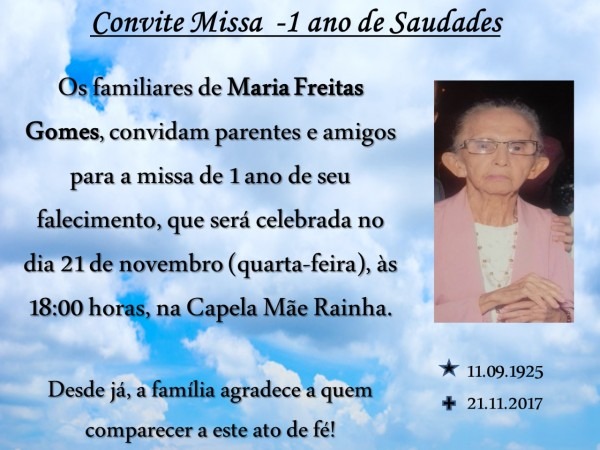 CONVITE MISSA DE UM ANO DE FALECIMENTO DE MARIA FREITAS GOMES ~ SOBRAL 24 HORAS. www.sobral24horas.com