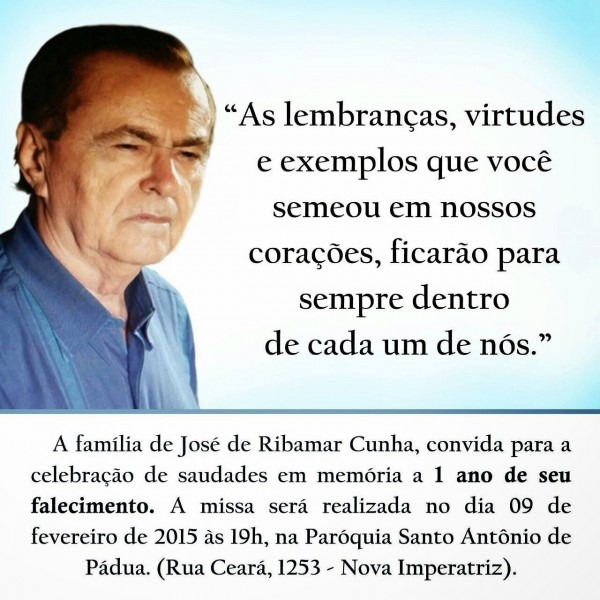 Convite: Missa de 1 ano do falecimento de Ribamar Cunha, hoje às 19h, em Imperatriz . Fatos e acontecimentos na velocidade do tempo. www.jhivagosales.com.br