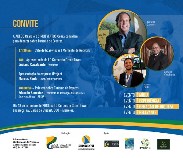 Convite . A ABEOC Ceará e o SINDIEVENTOS Ceará convidampara debater sobre Turismo de Eventos. Dia 18 de setembro de 2018, na LC Corporate Green Tower praticaeventos.com