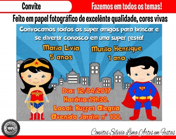 Convite Mulher Maravilha E Super Homem . Compre-o no Mercado Livre por R$ 23,90 - Compre em 12 parcelas. Encontre mais produtos de Brinquedos e Hobbies, Ar Livre, Malabares e Festas, Festas , Convites, Aniversário Infantil. produto.mercadolivre.com.br