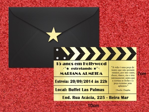 Convite Hollywood . Compre Convite Hollywood - Cinema 18x12cm no Elo7 por R$ 3,90 | Encontre mais produtos de Convites de Aniversário e Convites parcelando em até 12 vezes | Convite estilo Cinema/Hollywood imitando claquete dourada ou preta.