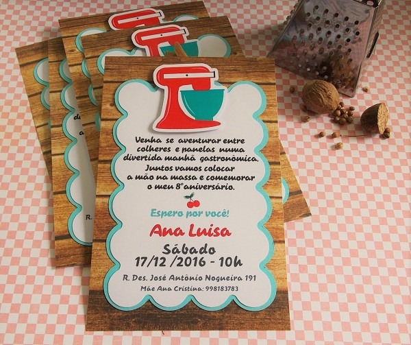 Convite Master Chef no Elo7 . Compre Convite Master Chef no Elo7 por R$ 6,79 com frete grátis | Encontre mais produtos de Convites de Aniversário Infantil e Aniversário e Festas parcelando em até 12 vezes | Convite retrô com aplique de batedeira em 3d sobre diversas camadas de papel: madeira, turquesa e branco. Convit..., 838D23 www.elo7.com.br