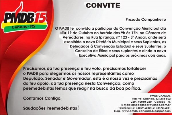 PMDB CANOAS / RS: CONVENÃÃO MUNICIPAL DIA 19 SÃBADO DAS 9 ÃS 17HORAS. pmdb-canoasrs.blogspot.com