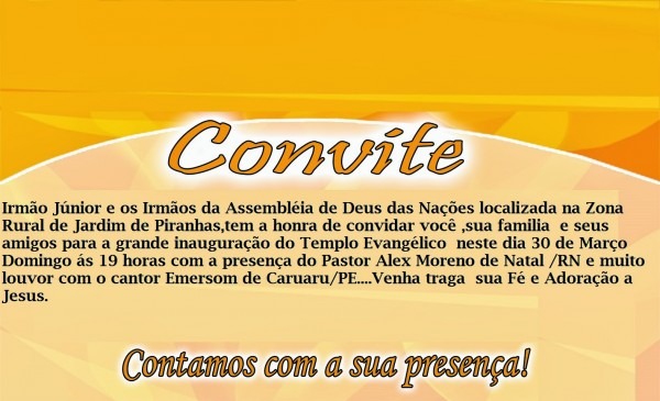 Convite April 2, 2019April 2, 2019 by ErinModelo convite inaugura??o igreja Vito D´Luck: INAUGURAÃÃO DO TEMPLO EVANGÃLICO DA ASSEMBLÃIA DE DEUS DAS NAÃÃES. vitodluck.blogspot.comCULTO DE INAUGURAÃÃO DO NOVO TEMPLO . ipfreguesia.orgM&M Artes Digitais: Convite e Folder. mmartesdigitais.blogspot.com Related posts:Convite para festa havaianaPapel para imprimir convite de casamentoConvite noite do pijamaPost navigationConvite azul tiffanyConvite da moana para imprimirLeave a Reply Cancel replyYour email address will not be published. Required fields are marked *Comment *Name * Email * Website Save my name, email, and website in this browser for the next time I comment. Δ