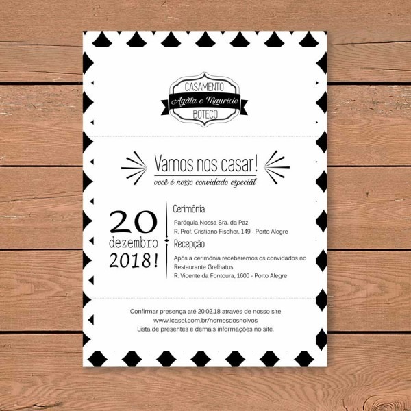 Convite econômico modelo Ãgata modelo 13 . O convite econômico modelo Agata é um modelo super charmoso, em auto envelope ( o convite tem duas dobras que se fecham ), confeccionado em papel Opalina de gramatura alta ( 240 g ) e impressão digital do layout em ambos os lados. no formato( medidas ) aberto: aproximadamente 16 cm X 22 cm. personalizeconvites.com.br