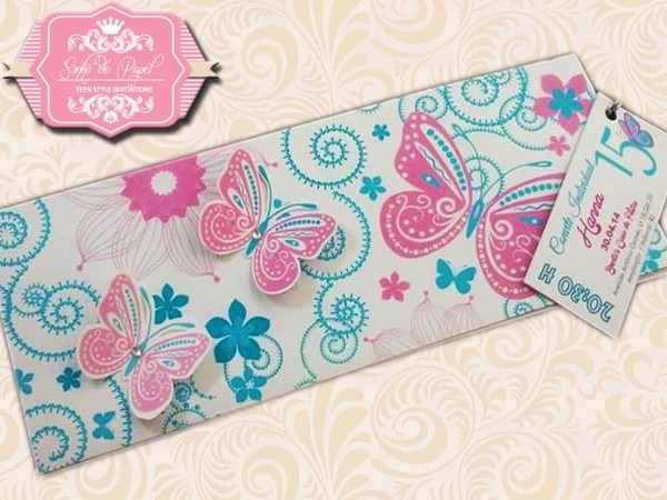 Convite 15 Anos . Compre Convite 15 Anos - Azul e Rosa no Elo7 por R$ 3,50 | Encontre mais produtos de Convites de 15 Anos e Convites parcelando em até 12 vezes | Convite 15 anos, borboleta rosa com azul e estampa arabesco. Detalhes borboleta 3D.